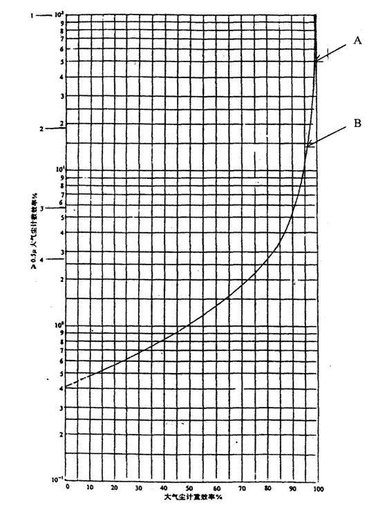 注:表中效率均是大氣塵分組計數效率(大氣塵分組計數效率是指以大氣塵為塵源,按≥0.3μm、≥0.5μm、≥O.7μm、≥l.0μm、≥2.0μm和≥5.0μm分組對過濾器進行計數效率的測定)。當大氣塵分組計數效率測定結果同時滿足表中兩個類別時,按低類別評定。 GB 12218-89 中規定I、II型過濾器效率亦可用人工塵計重法測試。